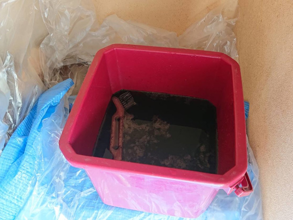 店舗など業務用エアコンのケースでは驚くほど真っ黒な汚水が出てきます。 - STEP6ケースを戻し表面の清掃&試運転で最終確認実