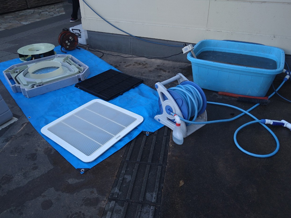(フィルター等)の清掃 - 外し終わったパーツなど一つ一つを丁寧にキレイに掃除します。