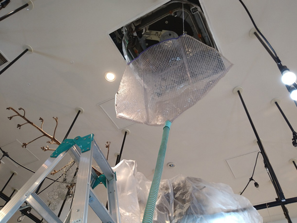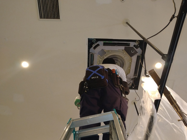 店舗や事務所などでは精密機器(PC)などもしっかりと保護。エアコン廻り以外も丁寧に養生します。 - STEP2エアコン本体の分解